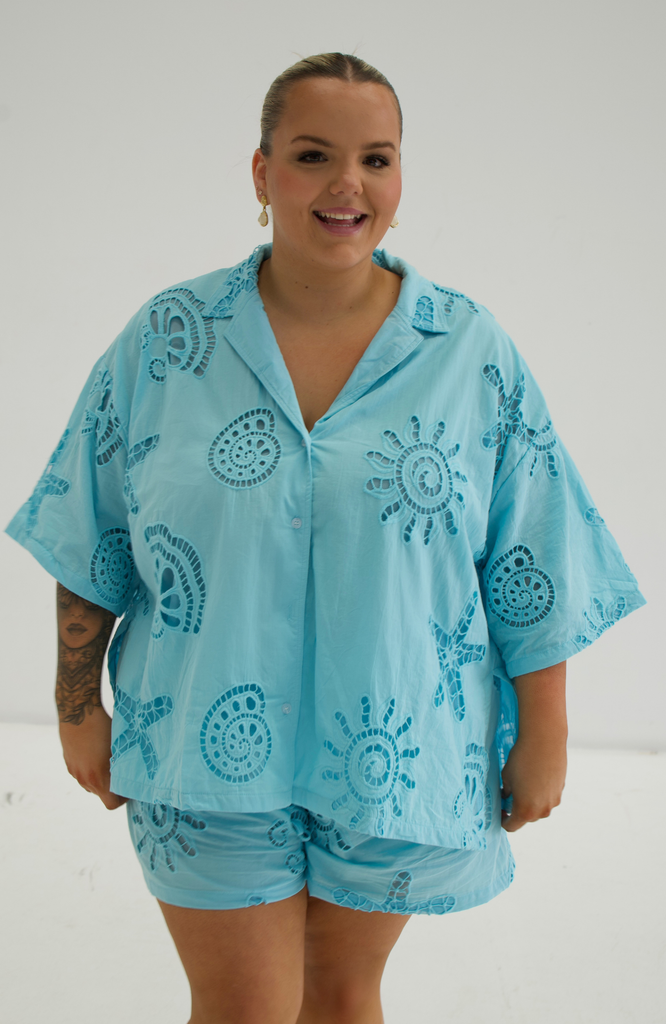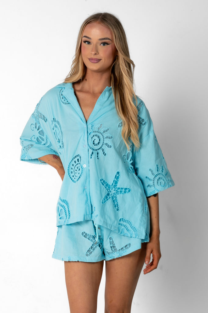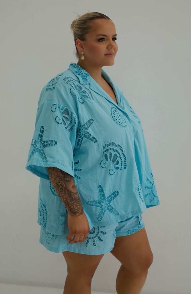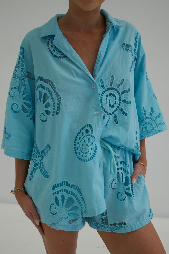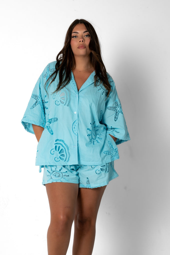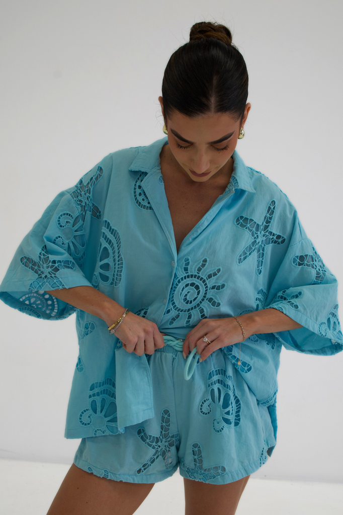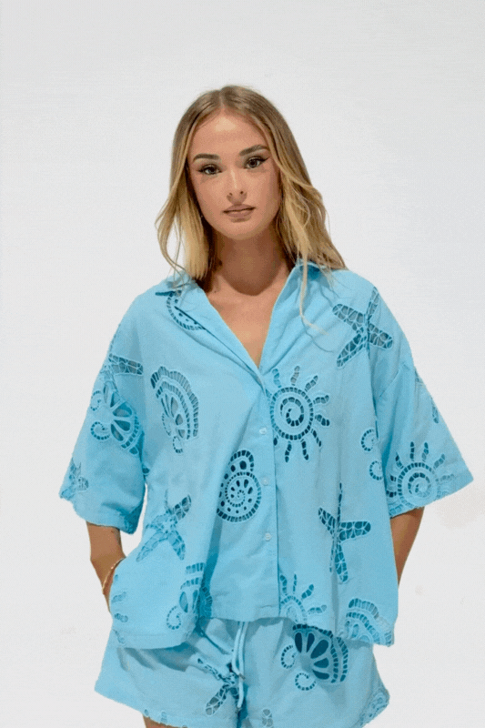 Breezy, effortless, and undeniably chic – the Santorini Set is your go-to for sun-drenched days and balmy nights. Crafted from 100% cotton, this two-piece ensemble features a relaxed button-up shirt with delicate cut-out detailing.