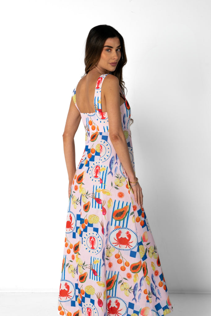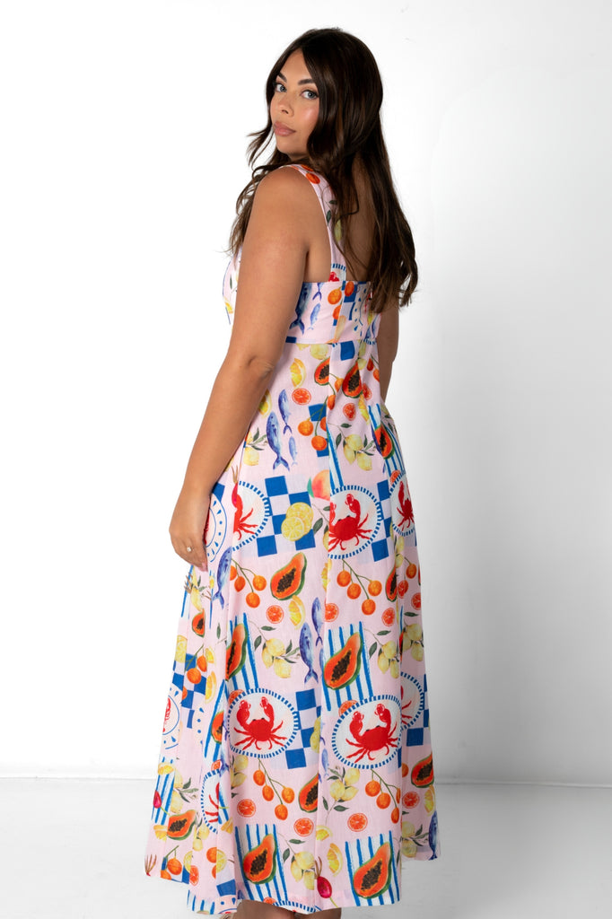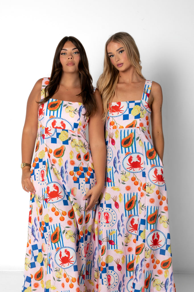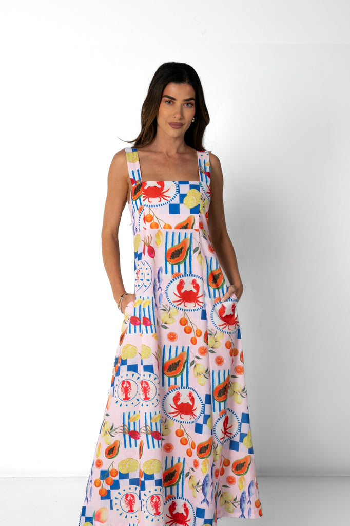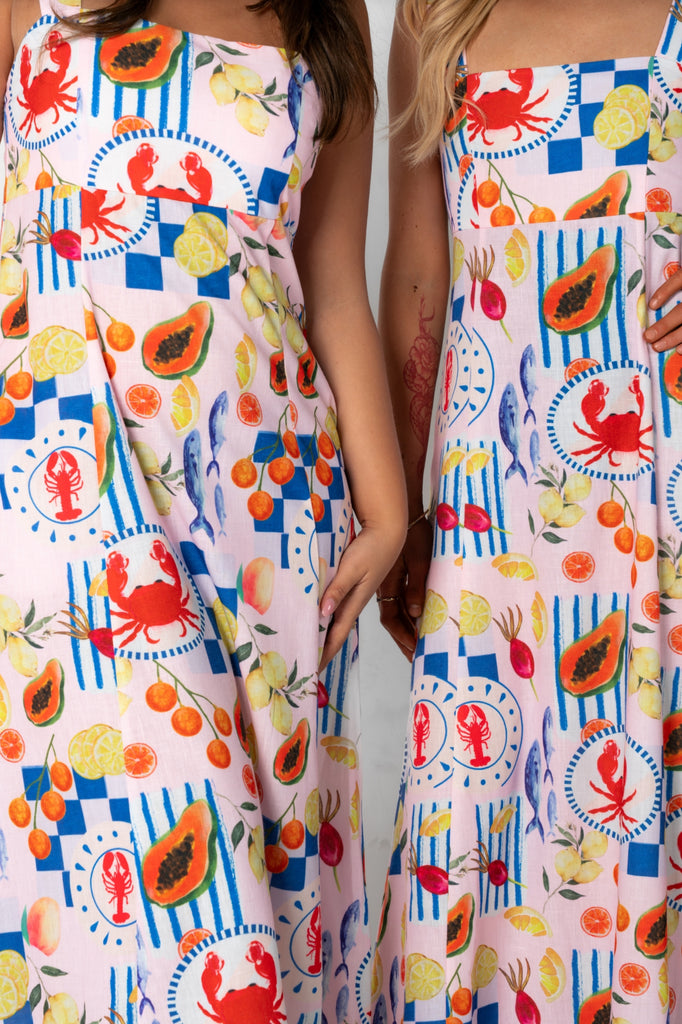 The exclusive San Sebastian print celebrates seaside charm in painterly tones — think vibrant crabs, fresh citrus, papaya, and ocean blues set against a pastel backdrop. With its wide straps for all-day comfort, flowing silhouette, and the ultimate everyday essential — side pockets — this dress is as functional as it is striking.