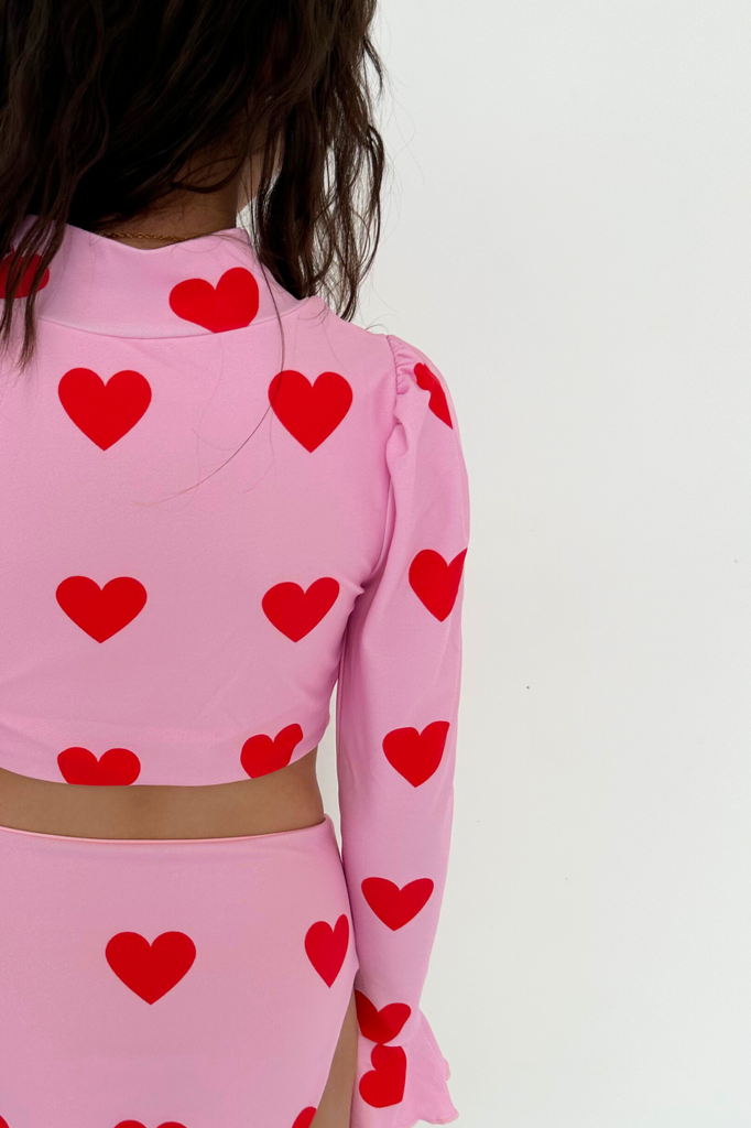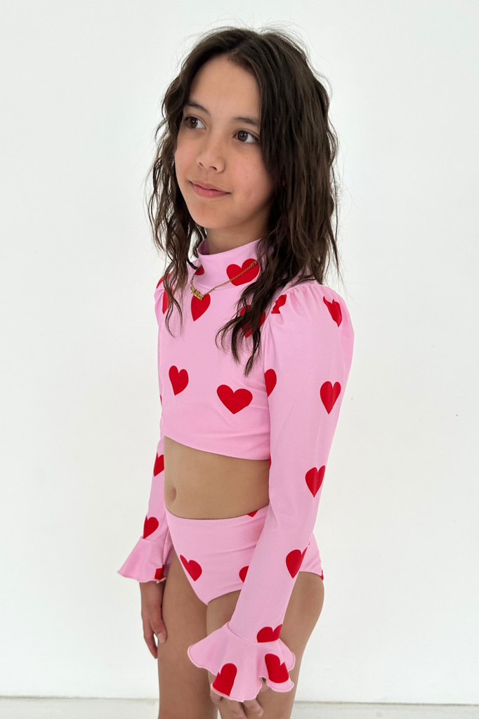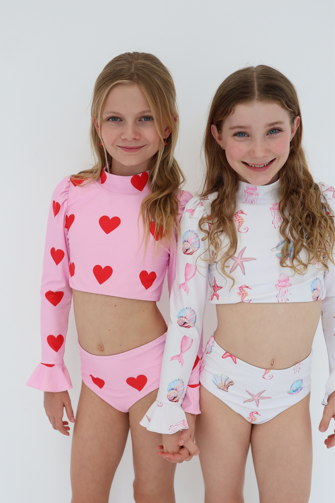 Two piece bikini - full length arms, slight puff sleeves and bell cuffs. high neck design crop top and classic cut briefs