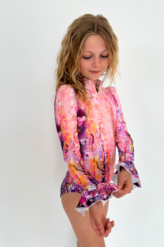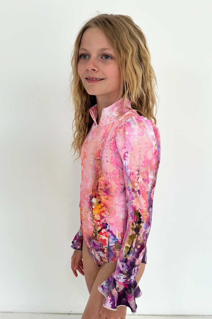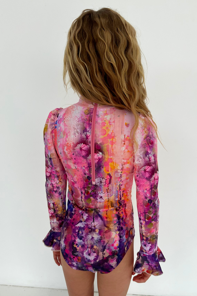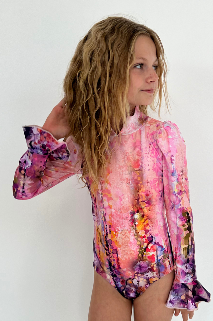Maillot de bain une pièce complet, détail col en V, manches légèrement bouffantes et poignets cloche.