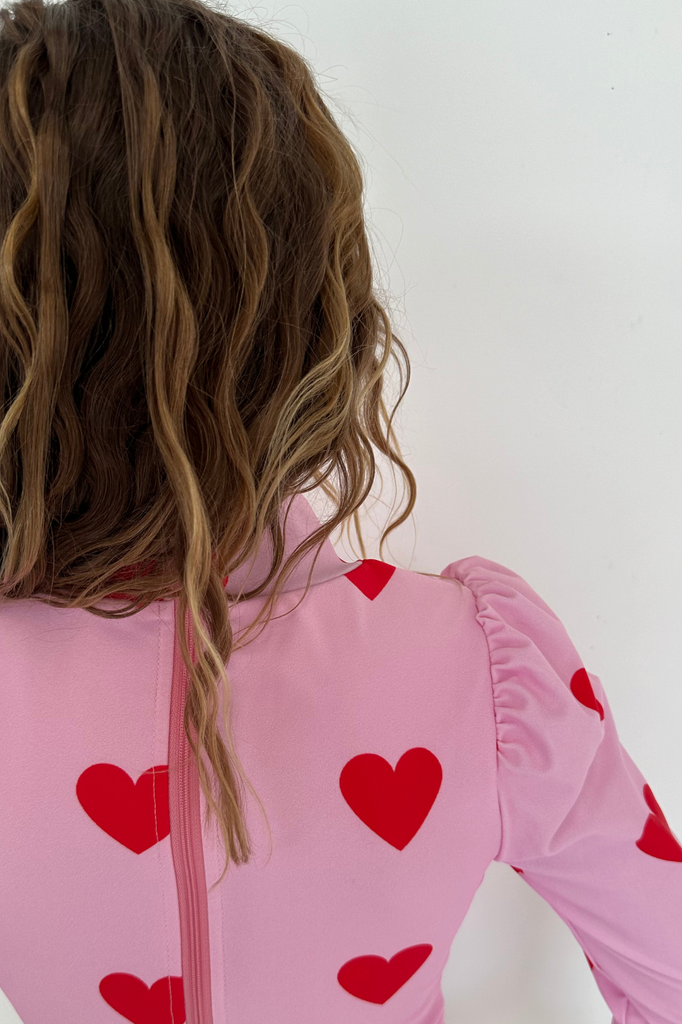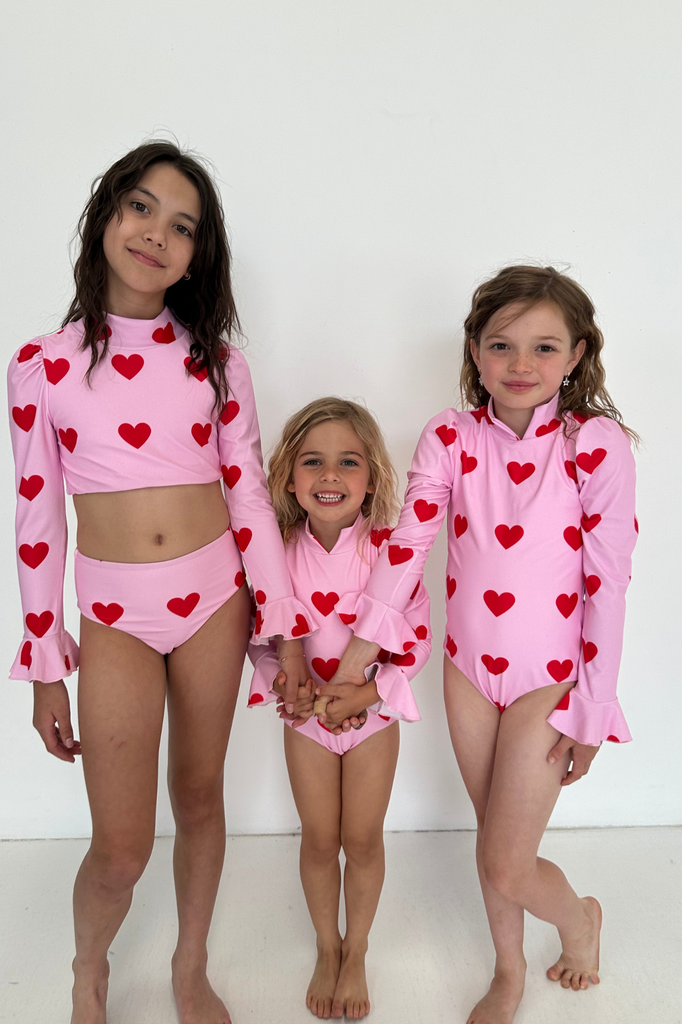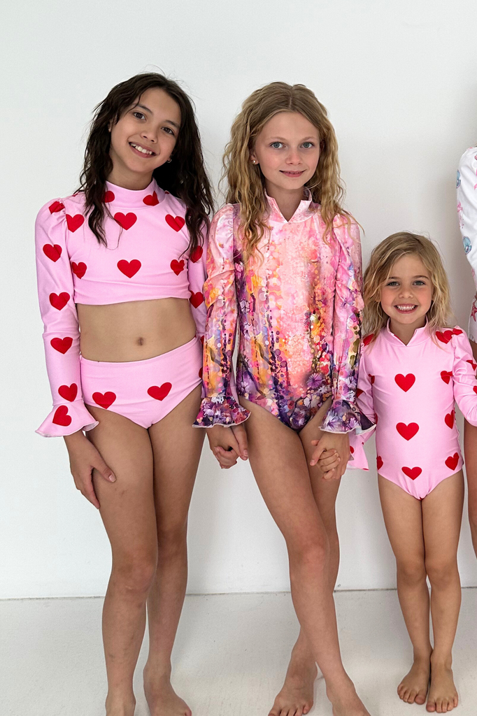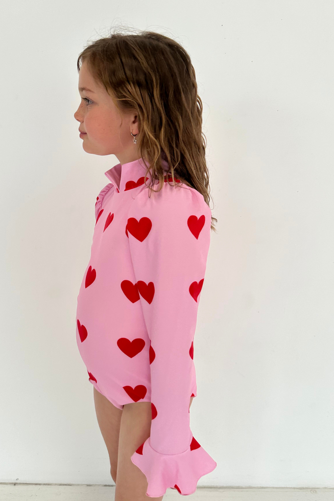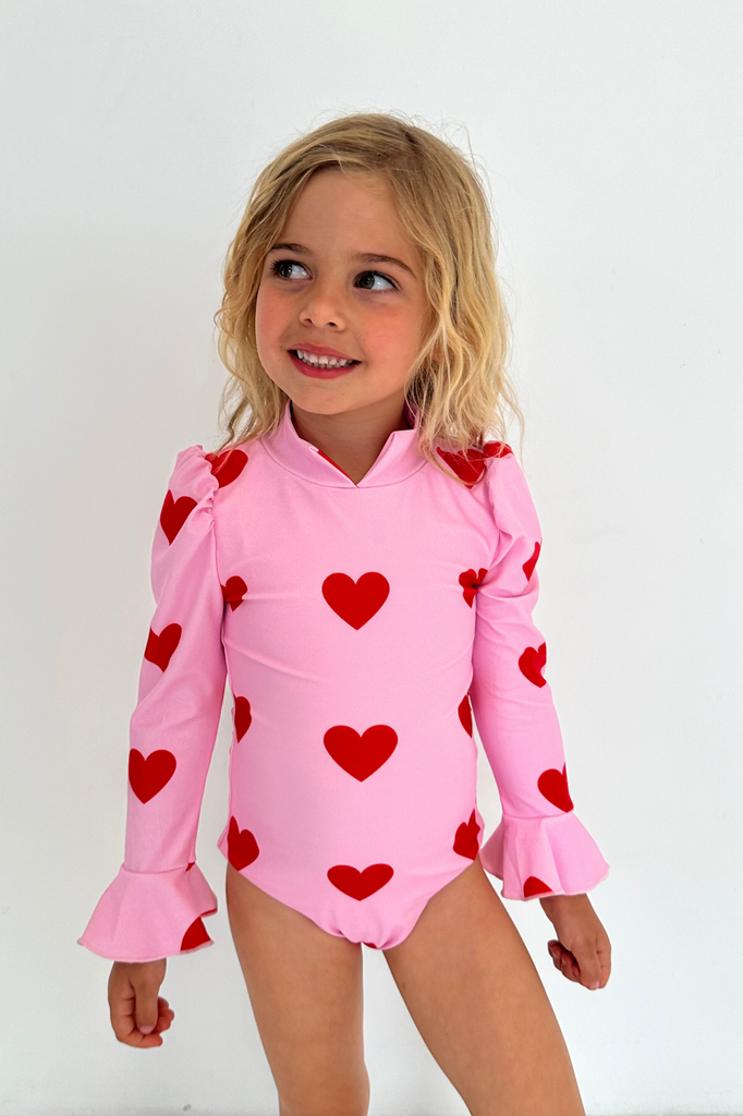 Maillot de bain une pièce complet, détail col en V, manches légèrement bouffantes et poignets cloche.