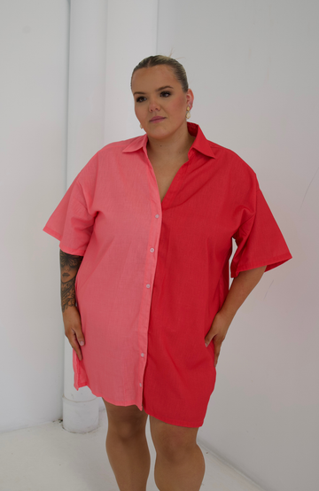 The bold two-tone pink palette brings instant Cali energy — vibrant, carefree, and endlessly versatile. Featuring a collared neckline, button-down front, and wide sleeves, it’s the perfect throw-on piece: wear it solo, layer it over swimwear, or style it with sandals or heels to take you from beach to brunch to sunset drinks.