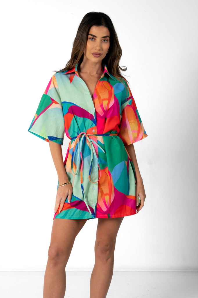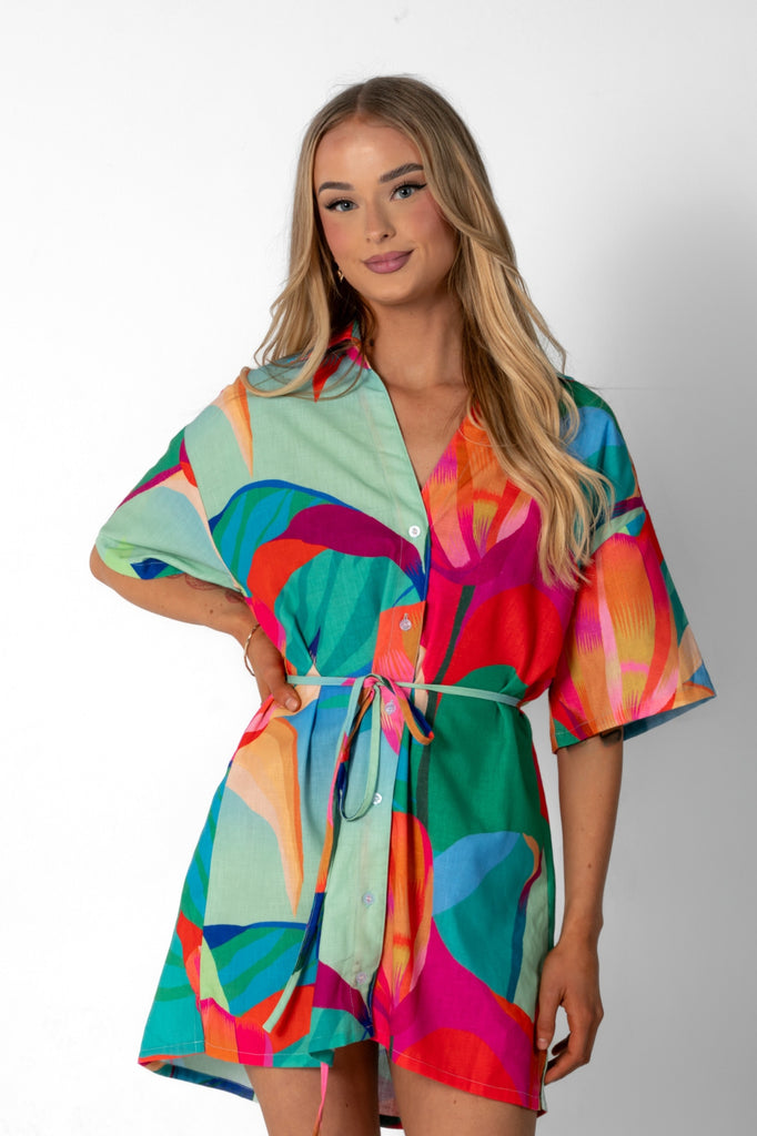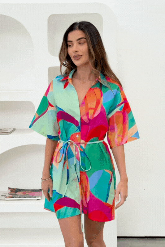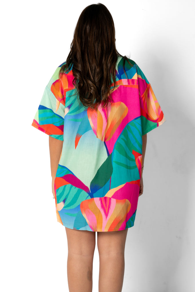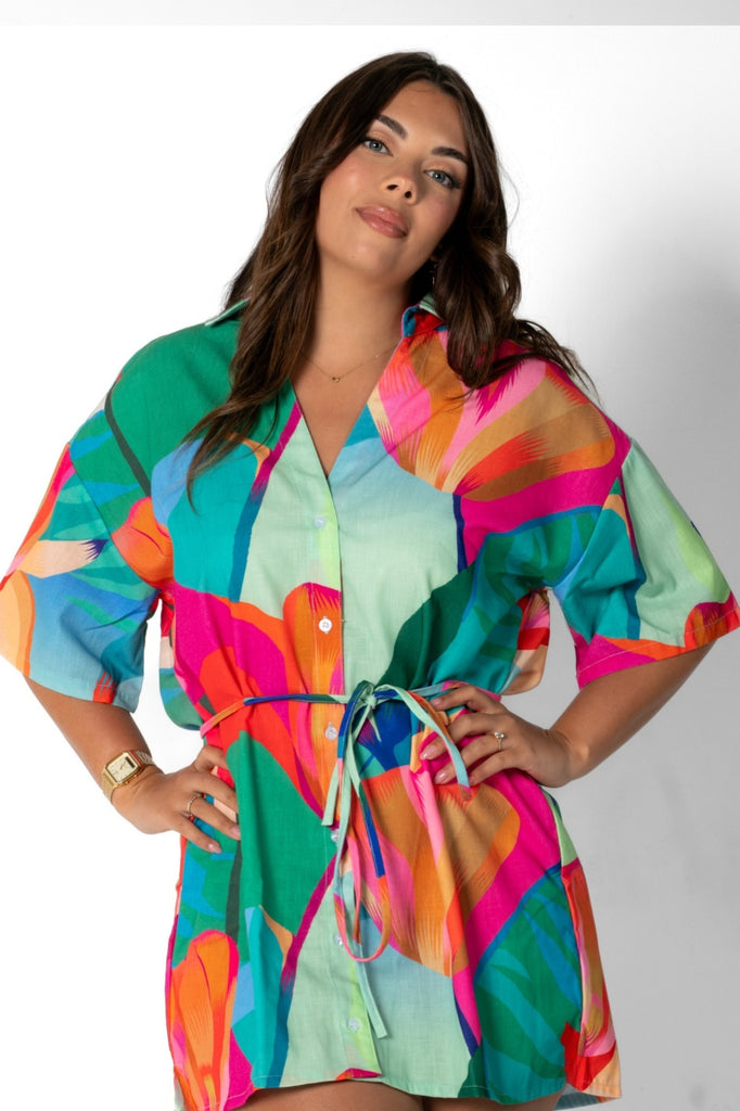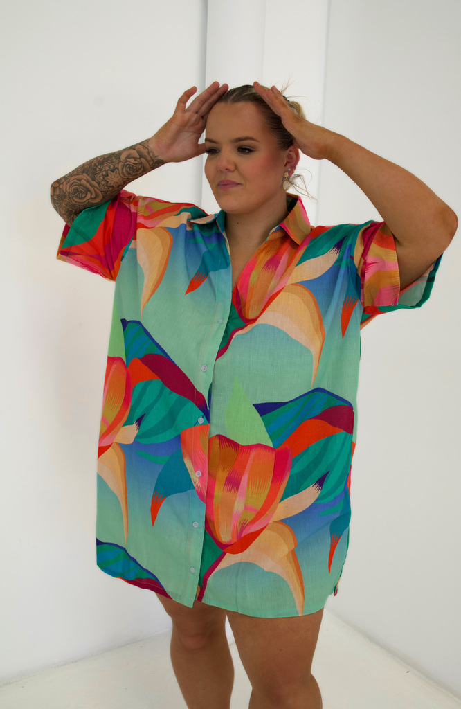 The statement Havana print captures the energy of summer — bold, vibrant, and endlessly versatile. Featuring a collared neckline, button-down front, and wide sleeves, it’s the perfect throw-on piece: wear it solo, layer it over swimwear, or style it with sandals or heels to take you from beach to brunch to sunset drinks.